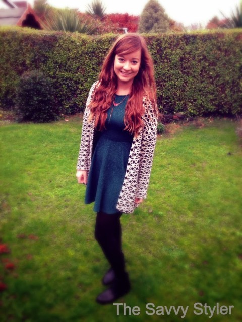 I hope your all enjoying the New Year so far! Due to the lovely weather we have in Ireland, half way through taking these photos it started raining so they were a bit rushed! I got this monochrome cardigan/blazer in Stradivarius sale. It was €19.99 and is very versatile. Here I have teamed it with a moss green skater style dress from Penneys/Primark. Since I bought this blazer style cardigan on Stephens’s day I have got great wear out of it. It looks just as good with skinny jeans as it does with dresses. My dress cost about €15 and i think that the colour is perfect for winter. Here, I wanted to show you all this statement blazer, but I also wear this dress with crop knit jumpers and it looks equally as good.