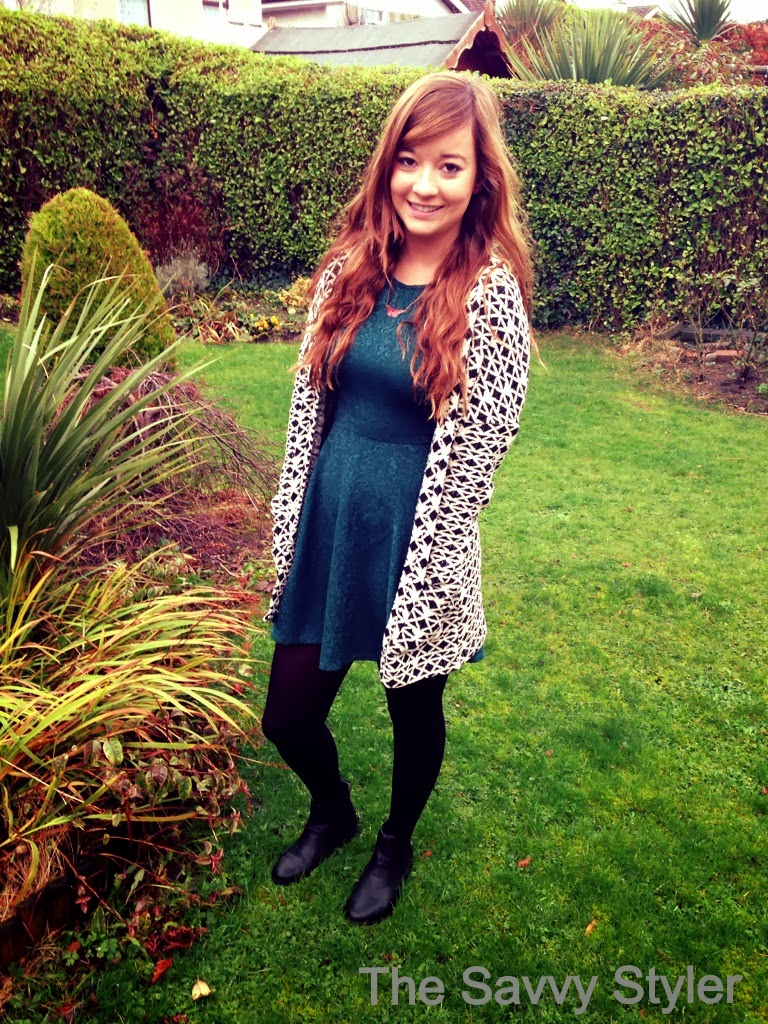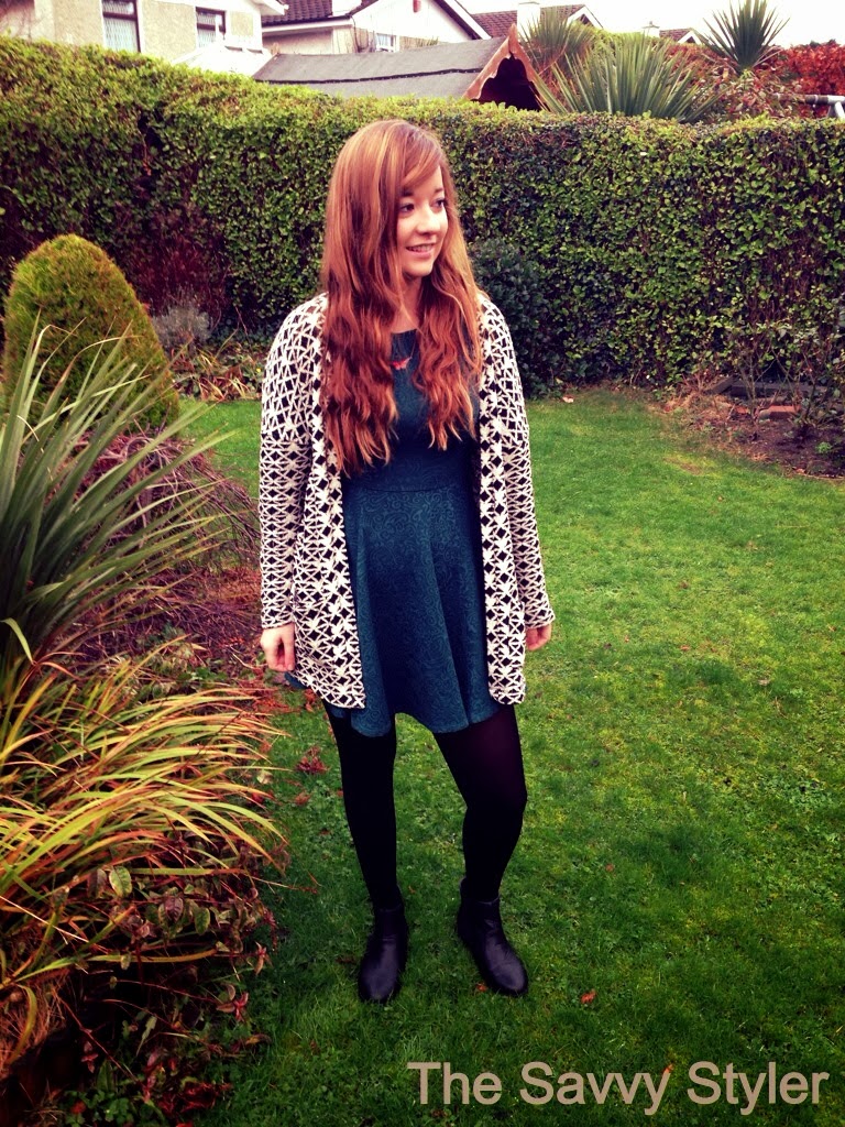 I hope your all enjoying the New Year so far! Due to the lovely weather we have in Ireland, half way through taking these photos it started raining so they were a bit rushed! I got this monochrome cardigan/blazer in Stradivarius sale. It was €19.99 and is very versatile. Here I have teamed it with a moss green skater style dress from Penneys/Primark. Since I bought this blazer style cardigan on Stephens’s day I have got great wear out of it. It looks just as good with skinny jeans as it does with dresses. My dress cost about €15 and i think that the colour is perfect for winter. Here, I wanted to show you all this statement blazer, but I also wear this dress with crop knit jumpers and it looks equally as good.