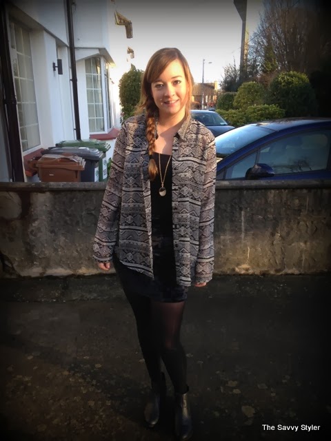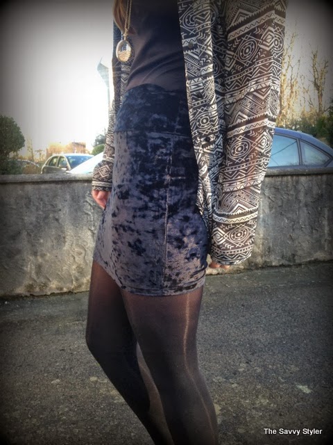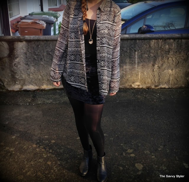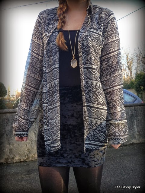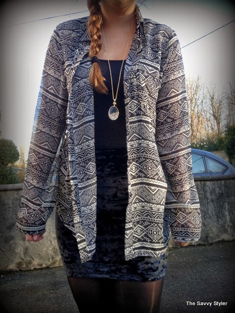 | Aztec Blouse – New Look Velvet Bodycon Skirt – Forever 21 Boots – Primark/Penneys Necklace – Forever 21 |