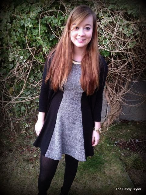 Here’s a dress I bought just before Christmas, if you follow my blog you might have noticed it in the Christmas Outfit Inspirations post I did a couple of weeks ago. Skater style dresses are something I wear a lot as I think they have such a flattering fit and are very versatile choices. I have too many to count in my wardrobe, weather they are skater style skirts or dresses! I have a little obsession! I love how this one is a little bit different with its tweedy style design and black panelling; it’s quite unique compared with the plain skater style dresses on the highstreet at the moment.