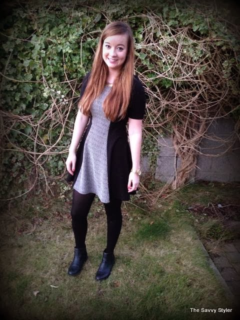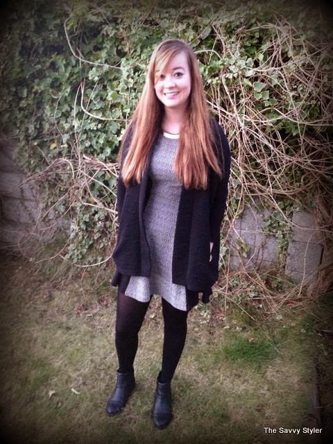 I wore this dress quite a lot over the Christmas. Here, I have it teamed with my black cape style cardigan/blazer from River Island and plain flat Chelsea boots that I picked up in Penneys/Primark. I also plan on wearing this for nights out paired with black court heels with the legs out and tan on! The collar of the dress has a simple necklace incorporated so you don’t have to worry about what kind of neck pieces you want to wear with it!
