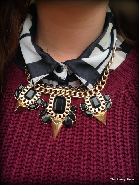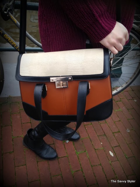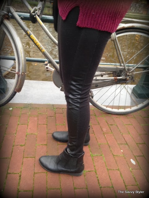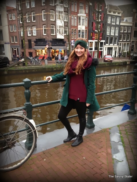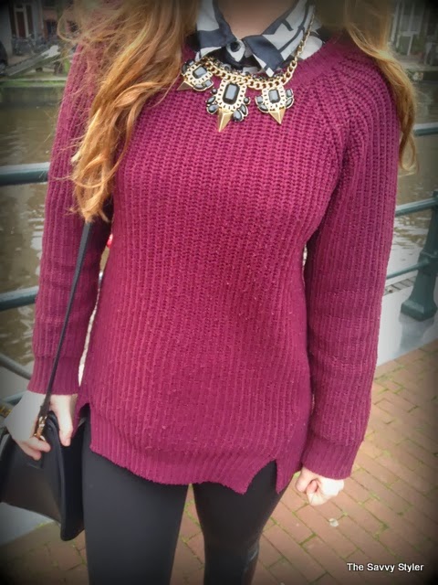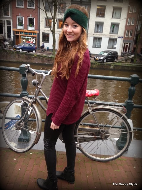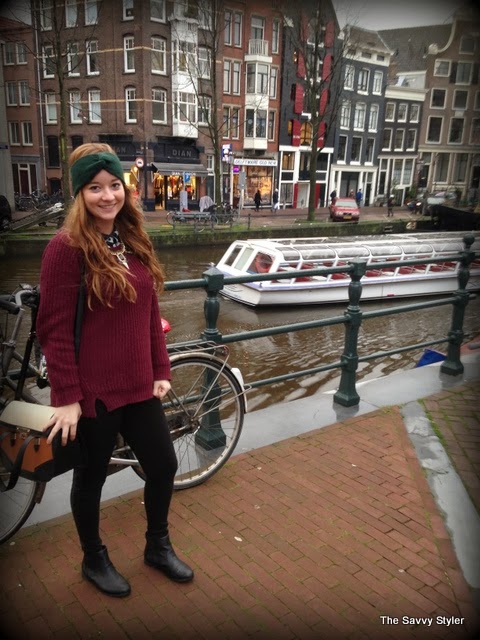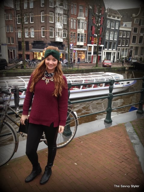 My outfit is quite simple, because we were travelling very early this day I wanted to be warm and comfortable so I layered up! My coat is from Urban Outfitters, it was featured on one of my very first posts and I have lived in it ever since. It was a perfect coat for Amsterdam as we had a bit of rain and it was very cold! My jumper is just a plain burgundy round neck from Penneys/Primark, I got it back in September and it has been a great addition to my wardrobe as I have worn it to death. My leggings are also Penneys best, I wore them because I thought they would be comfier than jeans on the plane and I love the leather look panelling down the side of them. It make them a bit different to your ordinary plain black leggings. I think they were both about €11 each! My blouse is from Forever 21 and I got it in the States at the end of the summer. I think it goes very well with the outfit, it adds an extra layer of warmth and I love the collar popping out! I also added my statement necklace again from Penneys/ Primark to finish the look.