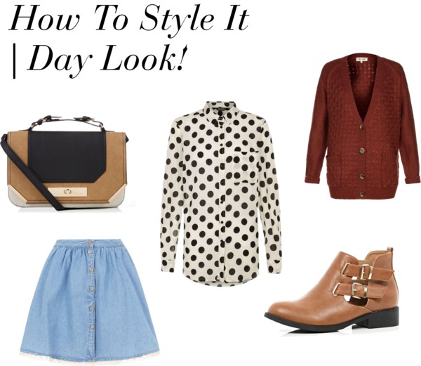 First up I am going to show you how to wear it for an everyday casual look that you can wear to college, out to lunch, shopping or just wandering around aimlessly. I really like the style of this blouse and it is quite similar to one I own ( it will be giving me outfit inspiration too!), it can be easily transitioned from a day to night look and I will be showing you how below. Here, I have teamed this monochrome polka dot blouse with this cute skater style button up denim skirt. This skirt is perfect for the spring and would go with lots of different things depending on the look you were going for. I have also added this chunky knit cardigan, tan cut out boots and a boxy tan handbag. I would advise wearing tight now to avoid frostbite, but you could wear this look in the summer by switching sandals for the boots and ditching the cardigan.