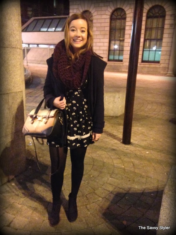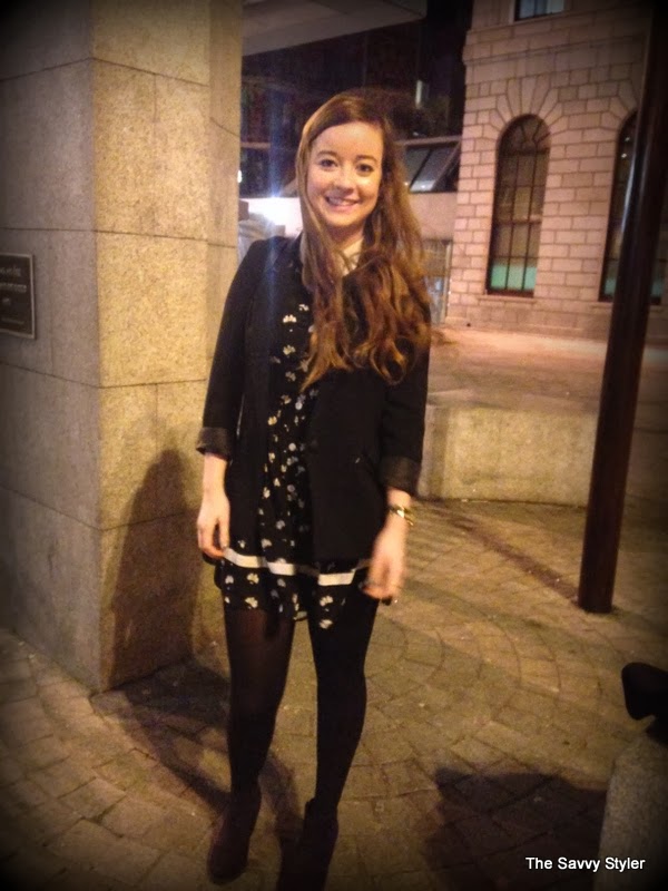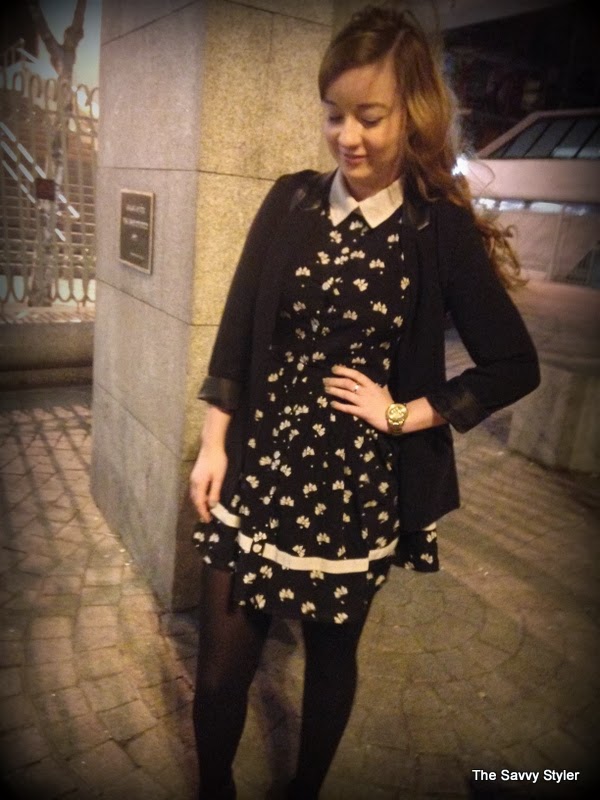 I got this dress about a year and a half ago in Forever 21 for around €20. I used to always wear it when I first bought it and forgot how much I love it! It’s a button up skater style dress with a simple bow pattern running through it. This dress has a very flattering fit and hugs you in all the right places giving you a nice flirty and feminine, fit and flare shape. The monochrome colouring makes it stand out and a little different, with the white collar and panelled line running through the bottom half of the dress. Here I have teamed it with a smart black tuxedo style blazer from Awear which was €15 in the sale around September last. I also wore my black heeled Chelsea boots in a suedette finish from H&M which set me back £20 so around €25. For a pop of colour, I would usually pair this monochrome patterned dress with my bright pink boyfriend blazer, but sadly I didn’t have that up in Dublin with me.