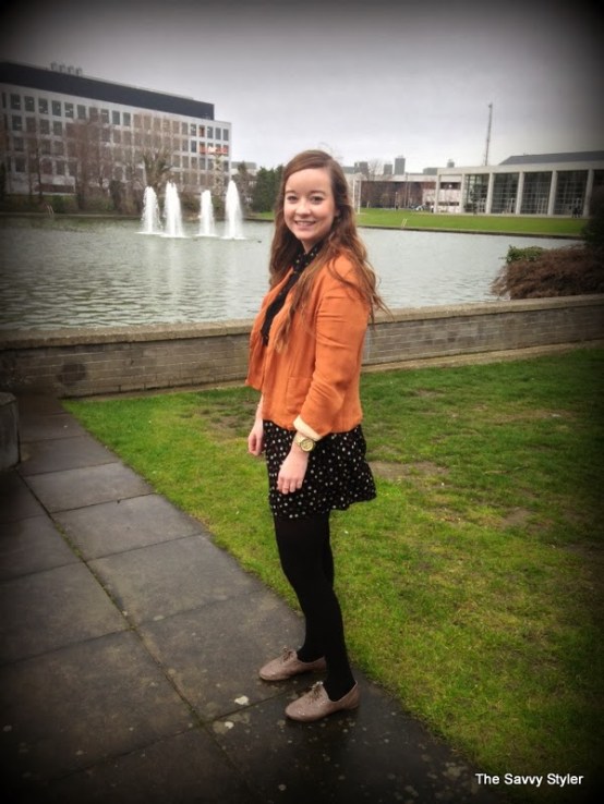 I got this blazer about two years ago in River Island for about €40 at the time, but was well worth it because it is made from really nice material and has a silk inner lining. The burnt orange colour is a bit unusual but complements this dress nicely. It would look equally as good thrown over light denim jeans and a simple top with some gold detail jewellery. This blazer is very light so it will be perfect for when the evenings are getting longer.