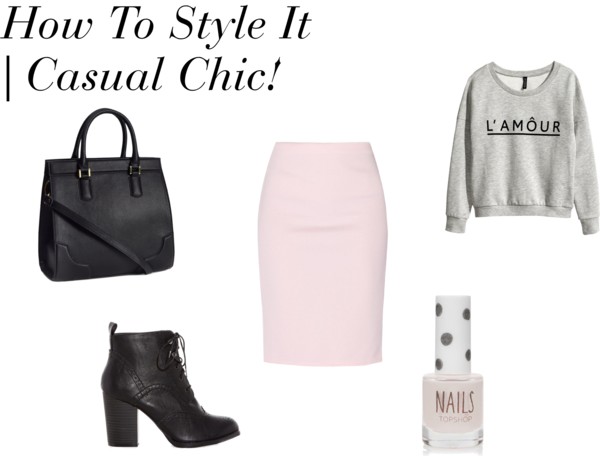Next, I have gone for a more toned down casual look that you could wear during the day running errands. This might not be everyone’s style but I love the word jumpers that are around at the moment. This would be a perfectly cosy but stylish pink look, and I feel the grey coloured jumper adds a bit of an edge to the feminine pale pink midi skirt. Here, accessories need to be minimalistic so that it’s not too in your face.