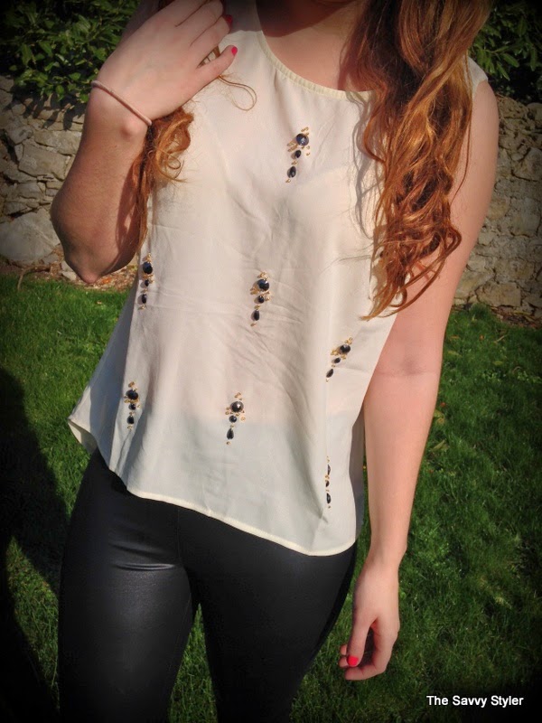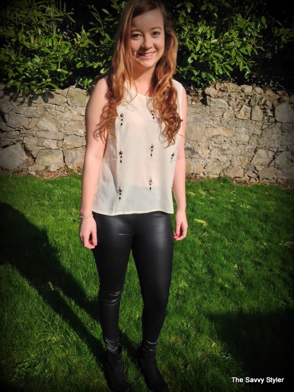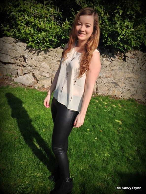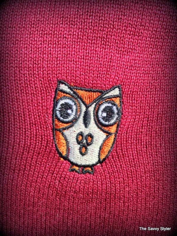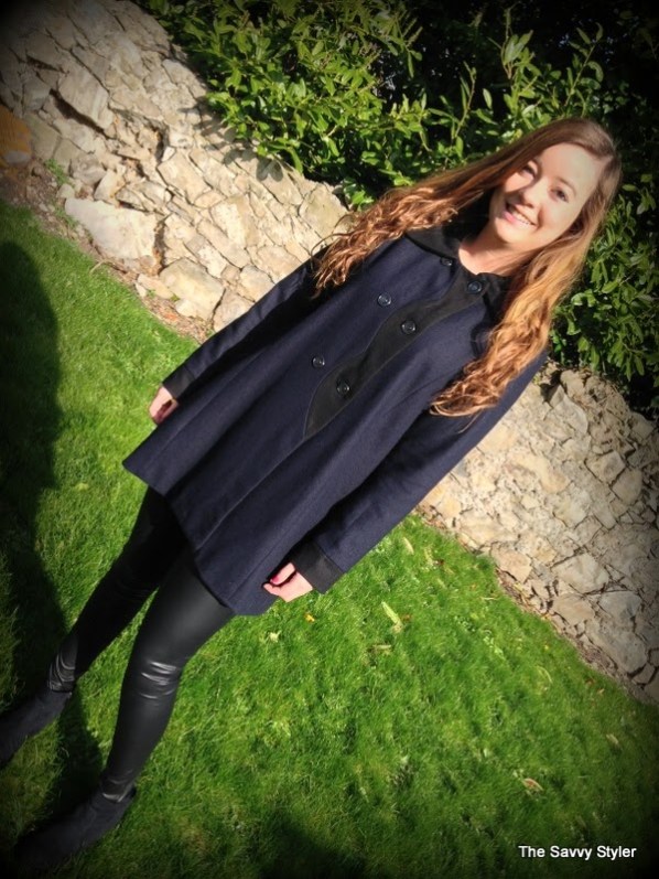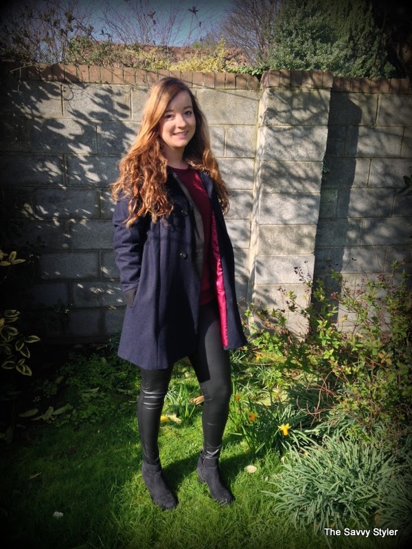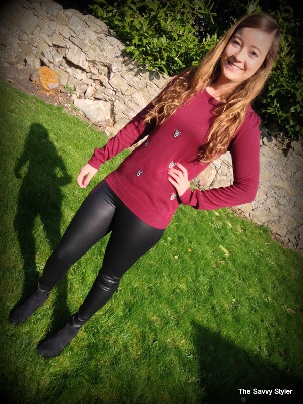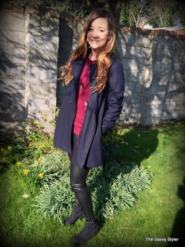 For my winning look, I chose an outfit that could be easily worn during the day and be transformed into a night time look by throwing the jumper into your handbag. So with this in mind, I went for this cream jewel chiffon blouse*, burgundy owl jumper*, black leather leggings* and this gorgeous navy and black coat*. I felt that this cream embellished top would look great day or night thrown over these leather leggings. I have been looking for a nice pair of leather leggings for a while now (I wore my last ones to death and had to throw them out!), so I was delighted to win these b.young leggings from Scarlet Fashion. To make the look more casual, I decided to match it with this owl print burgundy jumper.