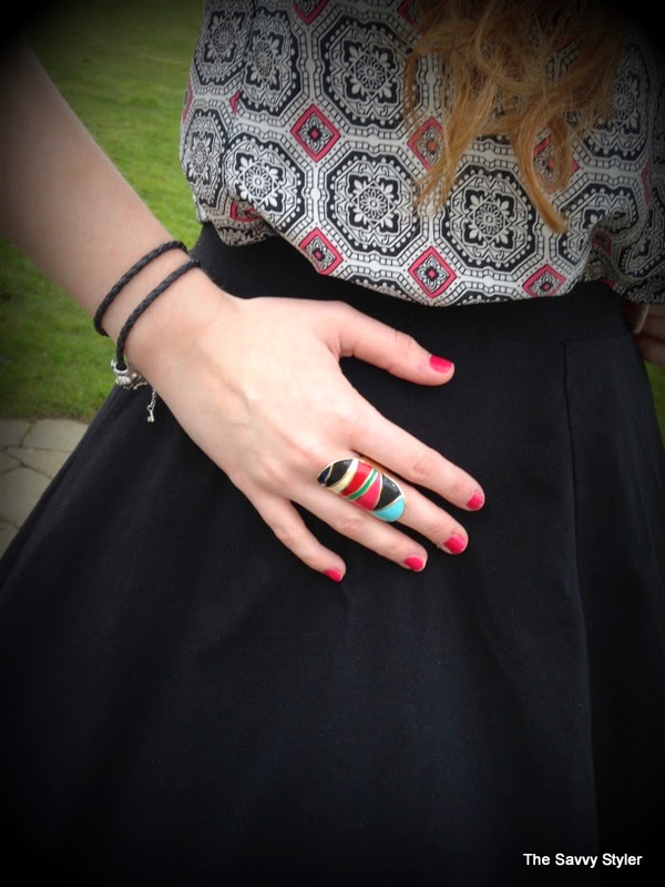 I got this top in Penneys/Primark a little while ago for only €7! I love the Aztec pattern and the bow detail at the bow detail at the back adds a bit of uniqueness to the top. Here, I have teamed it with my black skater skirt that is also from Penneys/Primark. I think this skirt is about two years old and it is still going strong! I always wear it and it is easy to dress it up or down depending on the occasion. I think a skater skirt is a staple piece that everyone should have in their wardrobe and it is flattering on many different shapes and sizes.My top has a subtle pink pattern running through it, so I thought my bright pink blazer would go perfect with it. It picks the colour in the top up nicely and adds a pop of colour too! This blazer is another oldie from my wardrobe. I think I bought it around two years ago in H&M for a bargain of €19.99! It is my go-to summer blazer! I usually team it with summer dresses or light blue denim jeans. What does everyone think of my ring? I love it and all the different colours within it! It’s perfect for sprucing up an outfit and it is quite unique! I got it in New Look for about €2.50 in the sale.