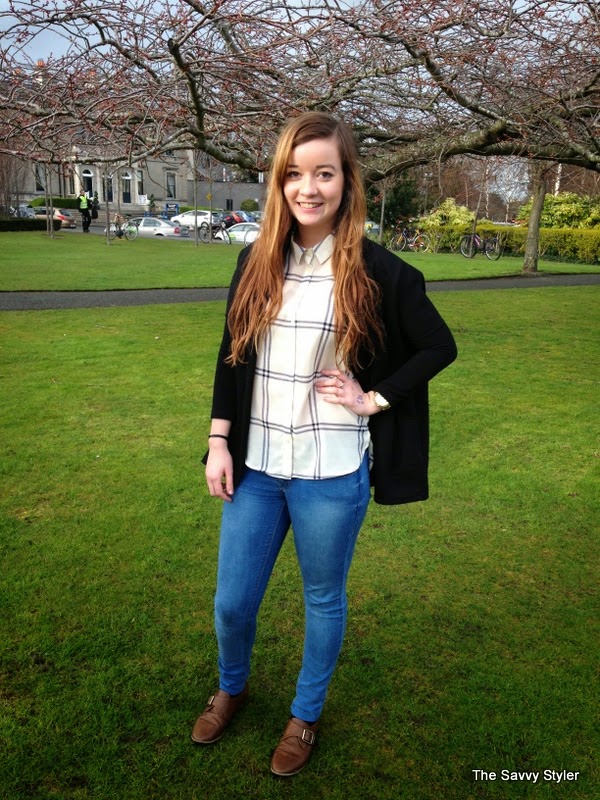I got this cream check style sleeveless blouse recently in New Look. It is the perfect alternative for Spring/Summer as it is in a nice light colour compared to the usual dark red and navy check shirts and blouses. Here, I have teamed it with my light blue skinny jeans from Penneys/Primark for a nice laid back casual look. I wore this outfit to college and it is very comfy if you are rushing in and out of lectures and group meetings. If you didn’t want to wear jeans and felt like giving this look a different twist, I think it would look great paired with a light denim or blue skater style skirt. I am in love with this one here from River Island! It’s on my wish list!
