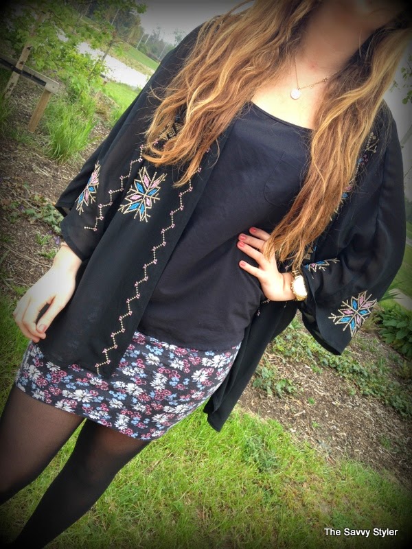 Okay, so on to the outfit. Today I have something I wore a couple of weeks ago in college. I think kimonos are a key piece for the summer months and I really love this one. It is simple enough to go with a lot of different outfits and to be styled in many ways, while still standing on its own with its gorgeous intricate stitching along the front and back. I got this in the sales way back at Christmas in anticipation for warmer weather. I think it cost be about €9 and it’s from New Look.