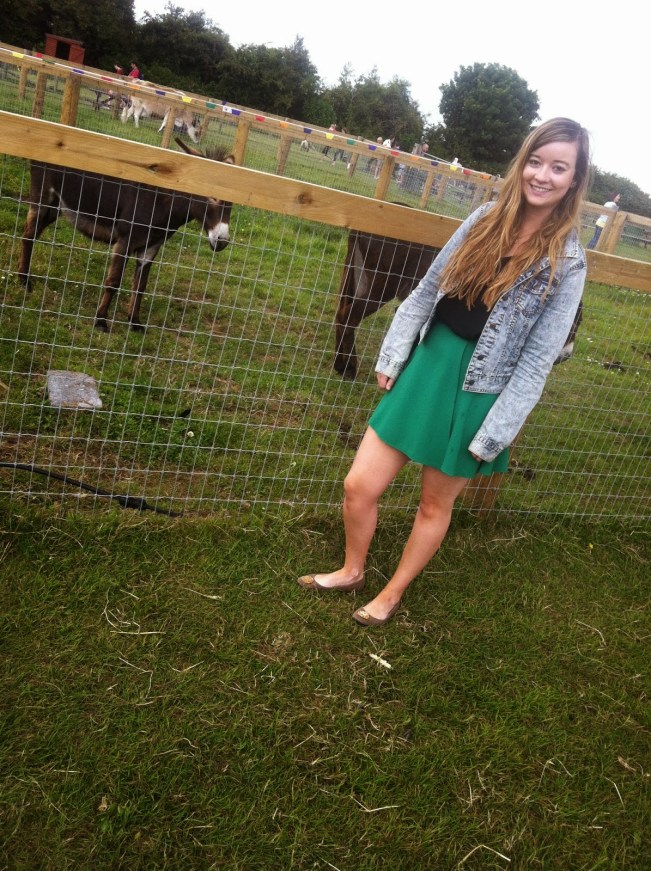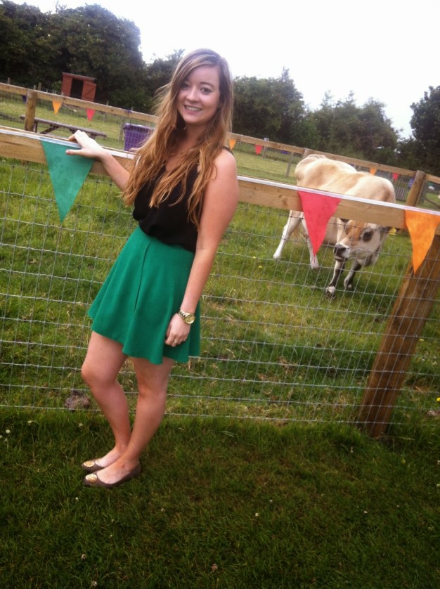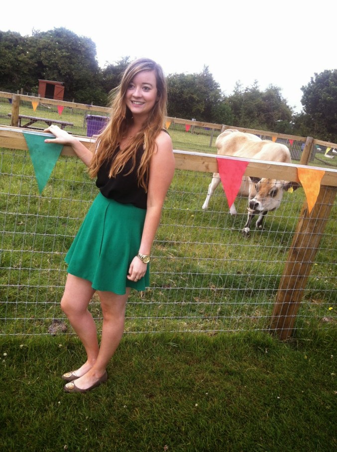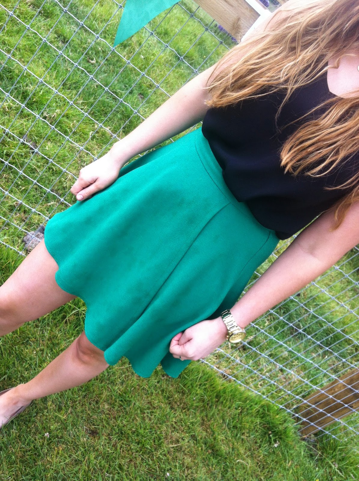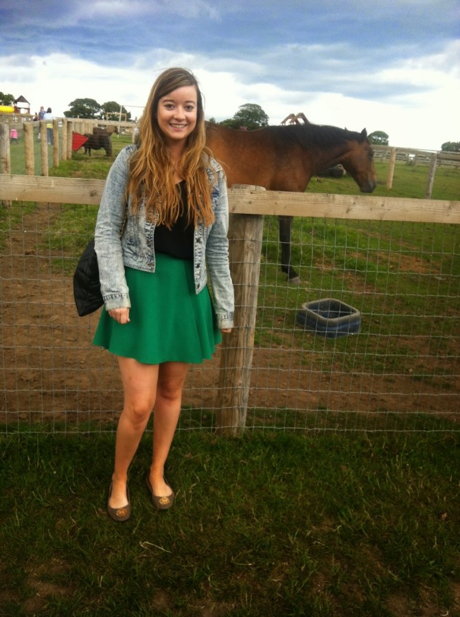 Here I am wearing a green skater style skirt that I picked up in Primark while I was in Scotland a few months ago. I have gotten so much wear out of it and it only set me back about £9! It was such a bargain! I have it teamed with a plain black cami from River Island, my Penneys denim jacket from last summer and these tan flat pumps that I got in Wallis last week.