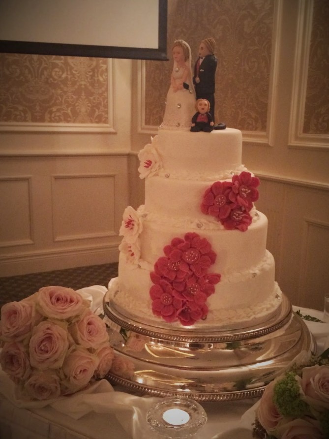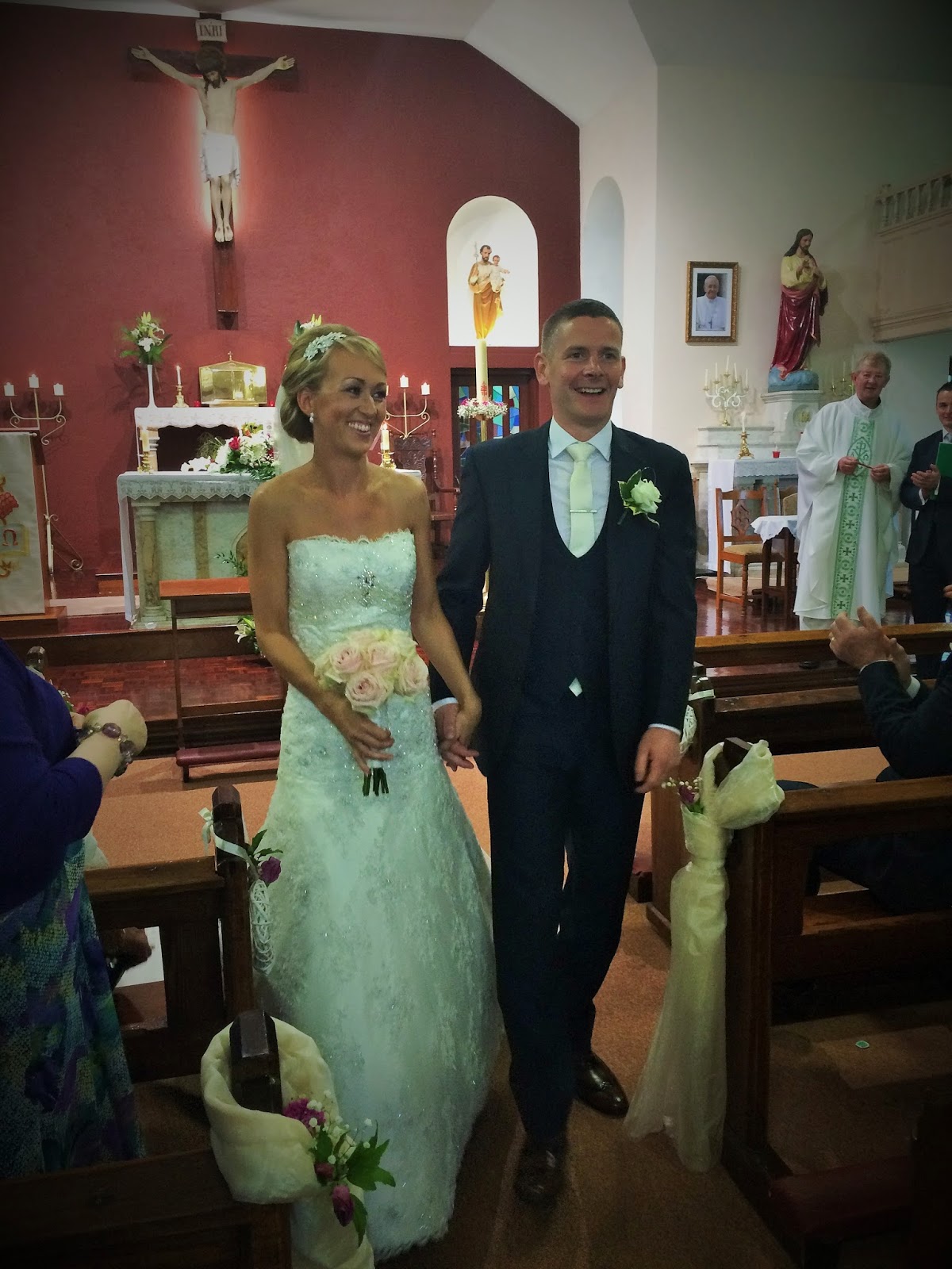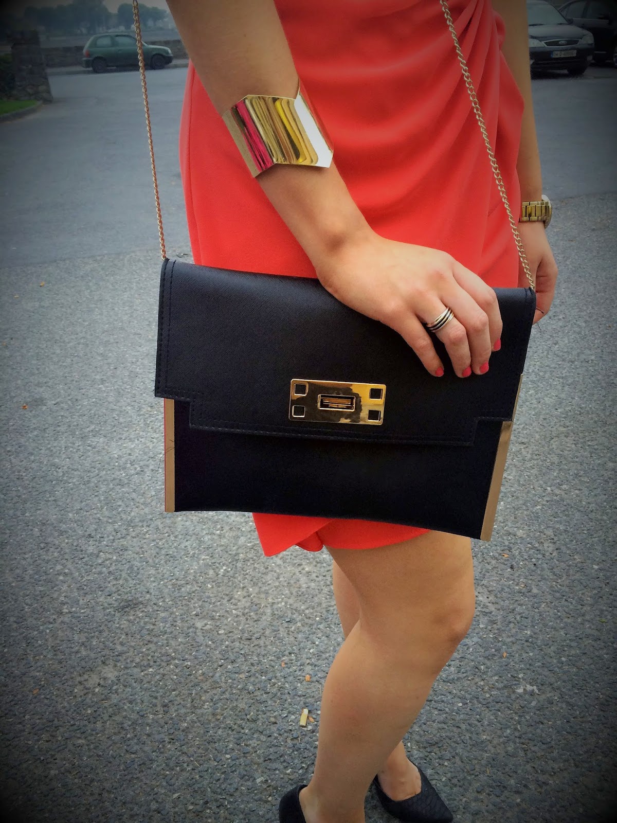 The dress is a gorgeous bright coral colour made from a silky chiffon feel material. The twisted drape effect at the front of the dress is what caught my eye off the hanger. The overall twist effect teamed with the shift style is what makes the dress perfect for many different shapes and sizes. The twisted front is great if you are bit self-conscious about your mid-section. It hides a multitude of sins and you can actually enjoy your dinner without the fear of bloating getting in your way of a night out or a wedding! I kept the rest of my look quite simple with black and gold accessories. I added this black clutch from New Look and pointed snake skin style point heels from River Island. Which are unbelievably comfy by the way! I danced in them all night and didn’t feel the need to change into the provided flip flops! Congrats Jean and Martin!