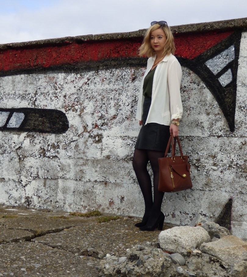 Today, I have chosen black and cream paired with a subtle khaki green sleeveless cami. This is a quite understated look, I tried to mix it up by adding different textures and fabrics. This leather look skirt from New Look adds structure and balance to what would be quite a feminine outfit otherwise. This simple cream blouse is from Dorothy Perkins and my green khaki cami is from Penneys, a bargain at €5.00. My block court heels and gold knot chain necklace are also from Penneys.